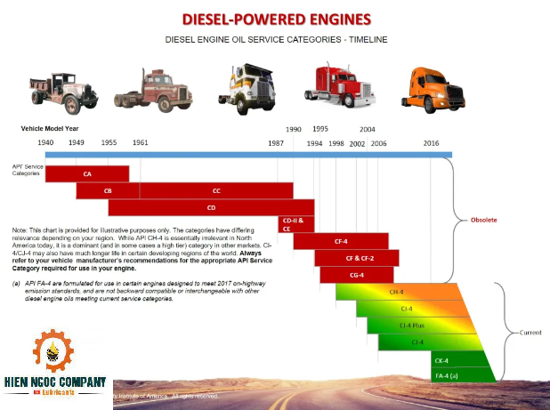 Tương tự như vậy, dầu nhớt động cơ diesel được phân thành các cấp API từ CA cho đến CK-4 (API CF, CG-4, CH-4, CK-4). Thời kỳ đầu, dầu nhớt có chức năng chủ yếu là bảo vệ và kéo dài tuổi thọ động cơ. Về sau dầu nhớt còn đảm đương thêm nhiều chức năng khác như giúp động cơ giảm tiêu hao nhiên liệu, giảm thiểu khí xả độc hại để động cơ đạt các tiêu chuẩn khí xả như Euro 3, 4, 5 hoặc 6.